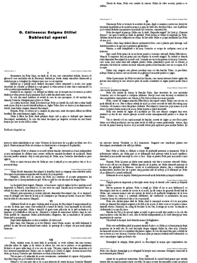 vizitati articolul complet aici : https://ro.scribd.com/doc/134351137/George-Calinescu-Enigma-Otiliei-Subiectul-Operei Destinul otiliei, al lui felix, al membrilor clanului tulea, al lui stanica. 5.51 (1930 note) am probleme cu acest referat! Romanul, alcatuit din 20 de capitole, este construit pe mai multe planuri narative, care urmaresc destinul unor personaje, prin acumularea detaliilor :